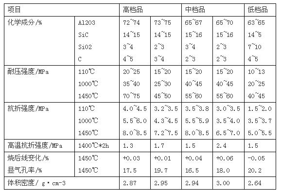 由于我國高爐出鐵溝過去一般用黏土熟料、焦粒、廣西白泥和焦油瀝青搗制而成的耐火澆注料,通鐵量少,修補頻繁,勞動強度大,污染環境;后來,采用Al2O3 ~ SiC ~ C 質搗打料,通鐵量顯著提高,但勞動強度大;到80年代后期,開發了Al2O3 ~ SiC ~ C質超低水泥耐火澆注料。該類澆注料一般用致密白剛玉、亞白剛玉、棕剛玉、優質高鋁熟料、碳化硅和鱗片石墨等材料,再摻加超微粉、結合劑和外加劑配制而成。其性能,見下表。表中,高中檔產品適用于大、中型高爐出鐵溝,中低檔產品則適用于中、小型高爐出鐵溝或渣溝。